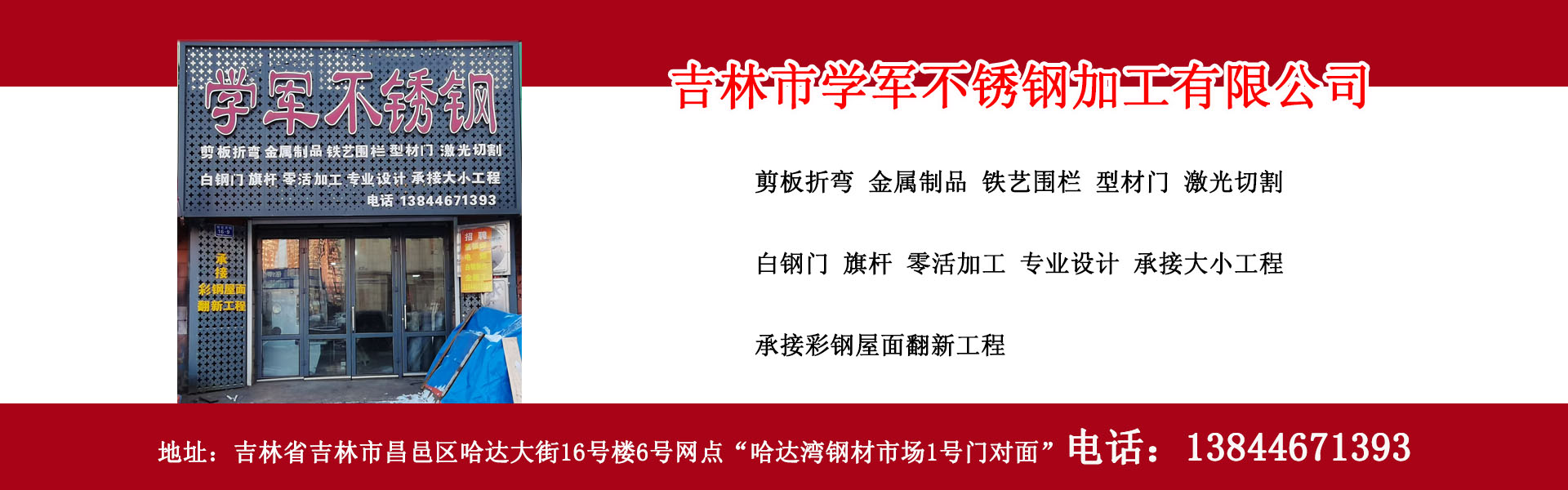 吉林市學(xué)軍不銹鋼加工有限公司擁有先進(jìn)的剪板機(jī)、折彎?rùn)C(jī)、刨槽機(jī)等剪折不銹鋼加工、金屬加工制作設(shè)備,擁有從業(yè)十余年的成熟技術(shù)骨干及專業(yè)團(tuán)隊(duì),先進(jìn)的設(shè)計(jì)理念為您量身打造各類不銹鋼加工制作、白鋼門制作、白鋼隔斷制作、剪板折彎、激光切割、型材門、電子感應(yīng)門、旗桿制作、彩鋼屋面翻新、鐵藝圍欄加工制作及金屬制品加工制作等機(jī)加產(chǎn)品服務(wù),可承接大小吉林市不銹鋼加工制作工程、吉林市金屬制品加工制作工程等。